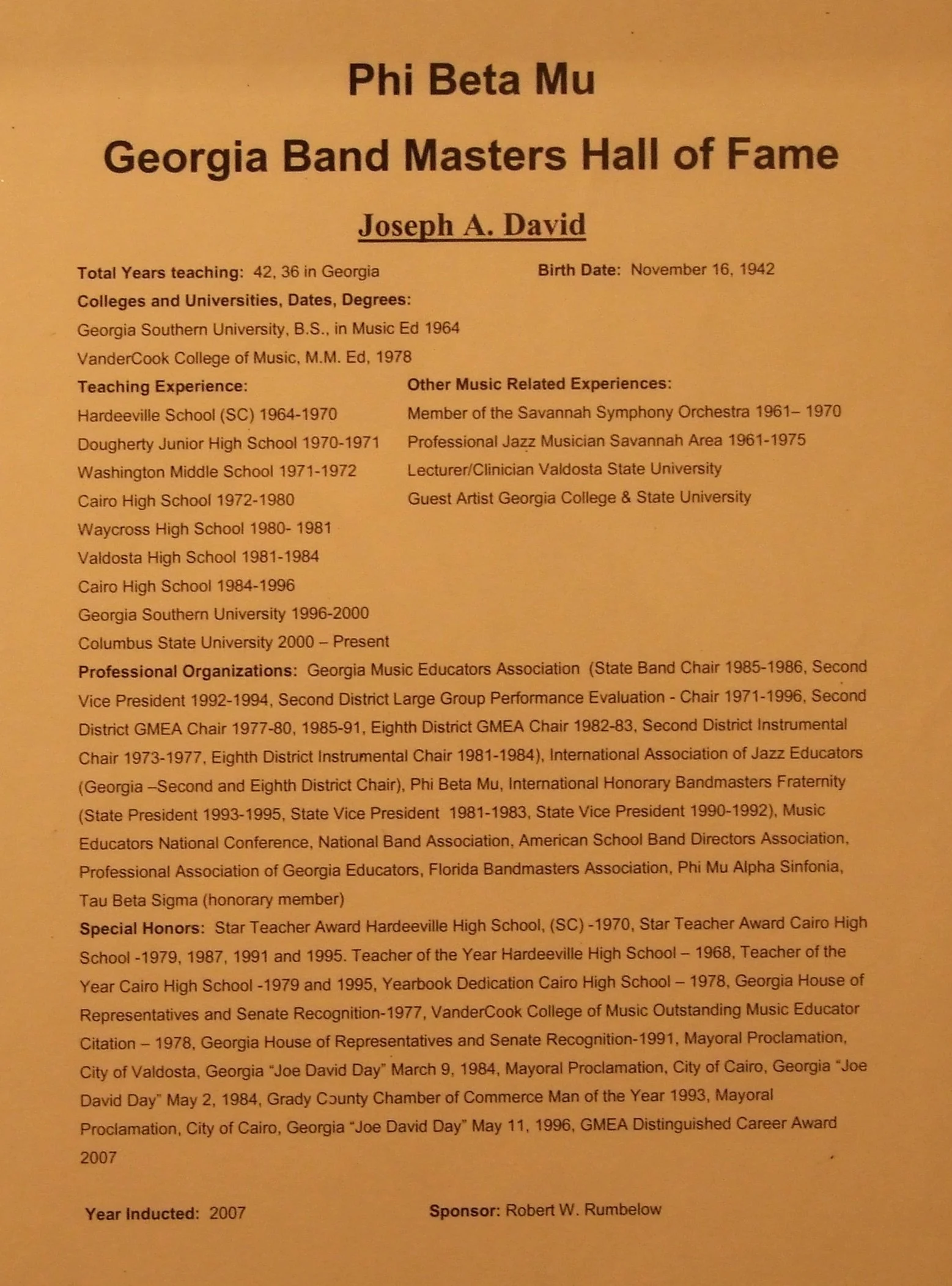 Georgia Music Educators Association (State Band Chair 1985-1986, Second Vice President 1992-1994, Second District Large Group Performance Evaluation - Chair 1971-1996, Second District GMEA Chair 1977-80, 1985-91, Eighth District GMEA Chair 1982-83, Second District Instrumental Chair 1973-1977, Eighth District Instrumental Chair 1981-1984)