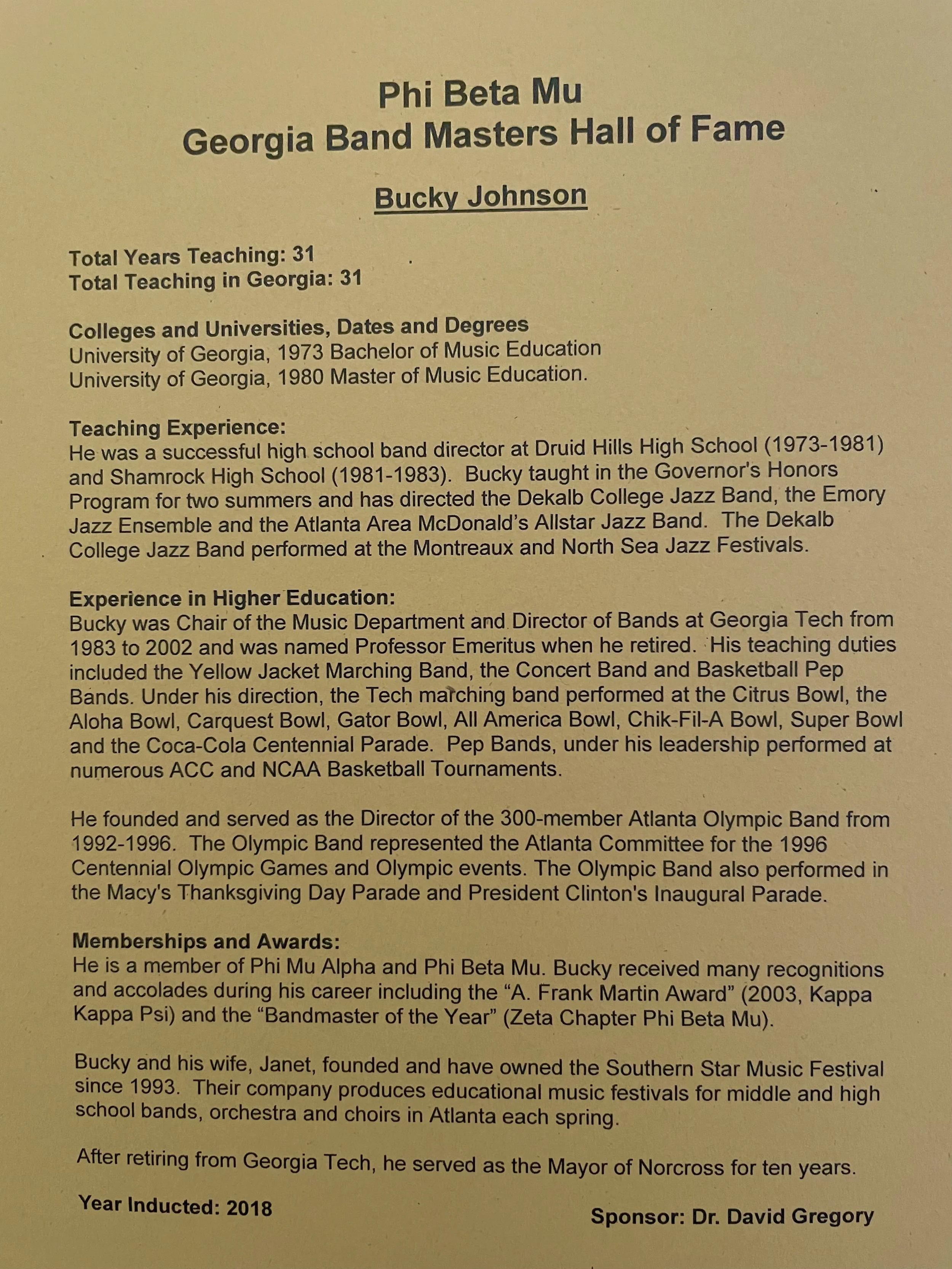 1983 to 2002 Bucky was Chair of the Music Department and Director of Bands at Georgia Tech and was named Professor Emeritus when he retired. His teaching duties included the Yellow Jacket Marching Band, the Concert Band and Basketball Pep Bands. Under his direction, the Tech marching band performed at the Citrus Bowl, the Aloha Bowl, Carquest Bowl, Gator Bowl, All America Bowl, Chik-Fil-A Bowl, Super Bowl and the Coca-Cola Centennial Parade. Pep Bands, under his leadership performed at numerous ACC and NCAA Basketball Tournaments.